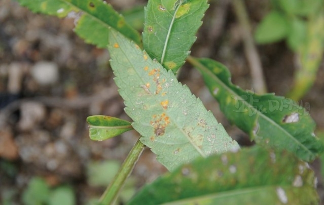 잎의 표면에는 경계가 불분명한 황색의 병무늬가 생기며 그 뒷면에는 등황색의 가루(여름포자퇴)가 생긴다.
