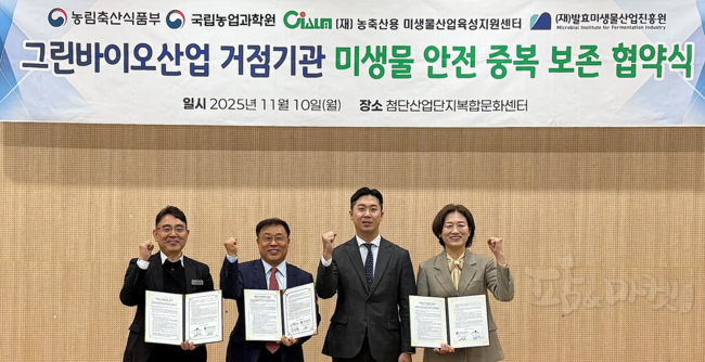 농림축산식품부(장관 송미령)와 농촌진흥청(청장 이승돈)은 11월 10일 전북 정읍의 첨단산업단지복합문화센터에서 국립농업과학원, 농축산용미생물산업육성지원센터, 발효미생물산업진흥원 등 3개 기관이 참여한 ‘그린바이오 산업용 미생물 안전중복보존 협약식’을 개최했다.