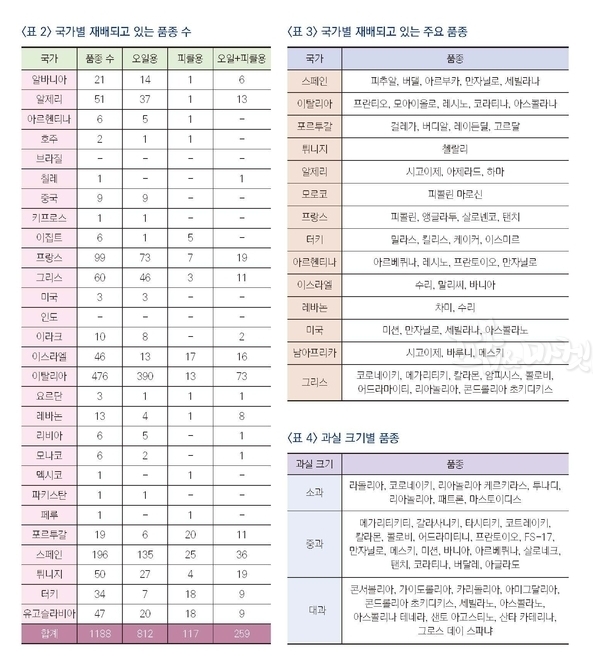 나라별로 재배되고 있는 품종 수는 이탈리아가 470여 품종으로 가장 많고 그 다음으로 스페인이 190여 품종으로 많이 재배되고 있다. 이 중에 오일용은 800여 품종으로 가장 많이 재배되고 있으며 피클용은 100여 품종, 오일과 피클을 같이 이용할 수 있는 품종은 250여 품종이다.