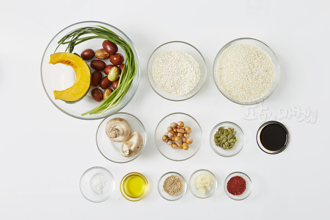 주재료 멥쌀(2컵), 찹쌀(1컵), 대추(10개), 단호박(1/6개), 표고버섯(2개)