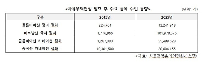 실제로 베트남산 국화 절화의 경우 2015년 약 177만 개에서 2025년 약 1억 개로 57배 이상 증가했으며, 콜롬비아산 장미와 카네이션 역시 같은 기간 수십 배의 수입 증가율을 보이며 국내 농가를 벼랑 끝으로 내몰고 있다.