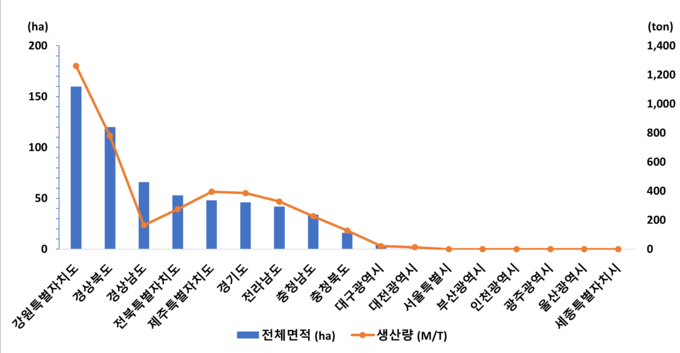 2024년 기준 국내 도라지 재배면적은 590ha, 생산량은 3,987톤이며, 이 중 강원특별자치도는 재배면적 약 160ha(27.1%), 생산량 1,261톤(31.6%)을 차지하고 있어 단순 면적 비중을 넘어 생산 중심지로서 역할이 크다는 점이 특징이다.
