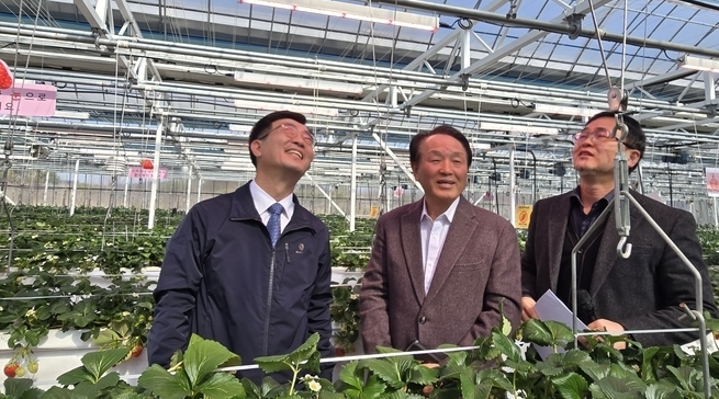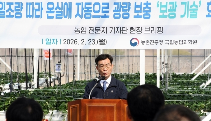 농촌진흥청(이승돈 청장)이 일조량 부족으로 생육 지연을 겪는 딸기 시설재배 농가를 위해 ‘광량 보상 동적 보광 시스템’을 개발하고 현장 실증을 마쳤다고 밝혔다.