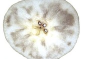 붕소 결핍증 증상 과실의 외관상 특징적인 변화는 나타나지 않으나 과실 적도면의 상부쪽 과육에서 붕소 결핍 증상이 나타난다. 그 증상은 두 가지로 구분된다. 첫째, 유관 속의 괴사부가 갈변하여 공동화하거나 둘째, 작은 괴사부를 중심으로 수침상이 된다. 괴사 조직의 크기는 직경 2∼6mm로서 다양하며 과실당 2∼6개 정도가 발생된다. 8월 상순부터 발생되기 시작하여 8월 하순경에는 육안으로 식별이 가능하다. ‘국수’, ‘이십세기’ 등 청배 계통에서 비교적 발생이 심한 편이고 ‘장십랑’ 등 갈색배에서도 다소 발생된다. 발생원인 사질 토양에서 붕소의 용탈이 심하거나 성목원에서 장기간 붕소를 사용하지 않을 경우 과실 부위에 결핍증이 발생한다. 붕소 수준이 토양 중에서 0.2ppm 이하인 경우, 충분히 전개된 잎에서 13∼18ppm 이하인 경우, 과실 중에서 16ppm 이하인 경우에 발생한다. 방지대책 배 과원에서 토양 중에 있는 붕소의 표준 함량은 0.5ppm이다. 그 이하 수준인 과원에는 10a당 2∼3kg의 붕사를 수관 하부에 고루 살포하고 가볍게 긁어준다. 일시에 너무 많은 붕사를 사용하면 오히려 붕소 과다 피해를 받게 되므로 주의해야 한다. 생육기 중의 응급