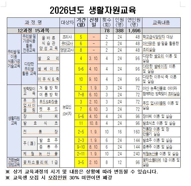 아산시(시장 오세현)는 농촌자원의 가치 확산을 위해 ‘2026년 생활자원교육’ 수강생 모집을 1월부터 본격 시작했다고 밝혔다.