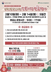 서울시농수산식품공사(사장 문영표)가 관리하는 국내 최대 공영도매시장인 ‘가락시장’과 복합쇼핑몰 ‘가락몰’에서는 2026년도 설 명절을 앞두고 농축수산물을 구매하는 고객을 대상으로 2월 10일부터 2월 14일까지 5일간 온누리상품권 환급행사를 진행한다. 이번 행사는 국내산 농축수산물 소비 촉진을 위해 농림축산식품부 및 해양수산부가 주최하는 행사로 가락시장 내 614개 점포가 참여한다. 고객은 행사 참여 점포에서 3만 4천원 이상 구매시 1만원권, 6만 7천원 이상 구매시 2만원권의 온누리상품권을 지급 받을 수 있다. 부류별 환급이 가능한 품목은 농축산물의 경우에는 국내산, 수산물은 국내산 및 원양산, 국내산(원양산) 원물 70% 이상 포함된 가공식품도 포함되나, 일반음식점이나 수입 농축수산물 등 구매 고객은 환급대상에서 제외된다. 부류별로 가락몰과 가락시장 중도매점포에서 환급 가능한 상품이 다르니 사전에 환급 대상 점포인지를 확인 후 구매하여야 하며, 배정 예산이 이미 소진된 경우에는 조기 종료될 수 있음에 유의해야 한다. 온누리상품권 환급은 고객이 행사 참여 점포에서 농축수산물을 구매 하면 점포주가 판매내역을 전용앱에 입력하고 이후 고객이 부류별 환급장소를