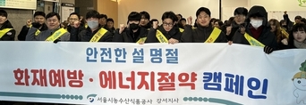 강서농산물도매시장이 명절 기간 화재 사고 제로(Zero)화를 위해 ‘참여형 안전 캠페인’을 전개했다 서울시농수산식품공사(사장 문영표) 강서지사는 설 명절을 앞두고 2월 4일 화재예방 및 에너지절약 캠페인을 실시했다. 공사와 유통인 약 80여 명이 참여한 이번 캠페인은 강서시장 전 구역을 직접 순회하며 △퇴점 시 난방기구 전원 차단 △소화전 주변 적치물 치우기 등 '주요 화재위험요인'을 집중 홍보했다. 또한 △사용하지 않는 플러그 뽑기 △불필요한 조명 소등하기 등 '일일 에너지절약 루틴'도 함께 안내했다. 특히 강서지사는 공사 캐릭터(친환경무농이와 신선이)를 활용한 쿠키를 제작하고 헤더택에는 홍보 메시지와 안전․에너지 관련 활동에 대한 만족도 조사 QR코드를 담아 배포하여 행사 참여자들의 적극적인 참여를 유도하였다. 아울러 참여자의 의견을 적극 수렴하여 반영함으로써 보여주기식 행사가 아닌, 실제 도매시장 안전․에너지 관리 수칙 실천을 유도하는 실효성 있는 화재예방 캠페인을 지속적으로 추진할 계획이다. 이봉준 강서지사장은 “설 명절은 화재 발생 위험이 높은 시기인 만큼 각별한 주의와 실천이 필요하다”며 “앞으로도 강서시장의 화재사고 예방에 최선을 다하겠다”고 밝